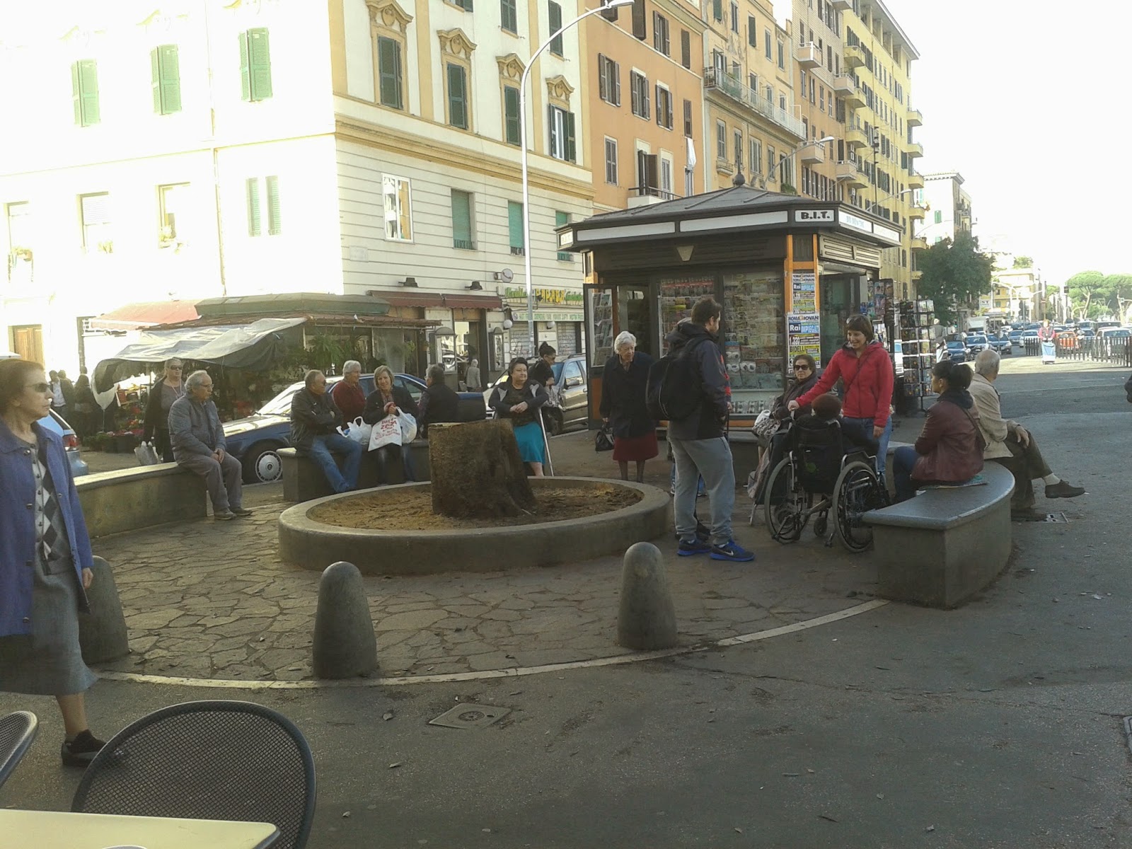 Ho chiacchierato anche io con loro, prima a bassa voce, per non disturbare un ambiente che non conosco, le loro confidenze, poi sfacciatamente tirando fuori il cellulare con l’auricolare: in diretta per la trasmissione radiofonica Roma… ti amo!, su Radio Città Futura, ho conosciuto il barista Luciano, “la signora che capava i fagiolini”, Mario l’escursionista e quelli che erano seduti accanto a lui, tutti innamorati del loro quartiere e dell’albero che non c’è più ma che vogliono sia ripiantato e soprattutto conservato in vita, stavolta. Tutti ci hanno invitato a rimanere, parlare, scoprire pezzi di Roma che va al mercato, si gode di nuovo il sole, chiede alla badante di dare due spicci all’artista di strada e alla giornalista di tornare a fare due chiacchiere perché è bello. Grazie.